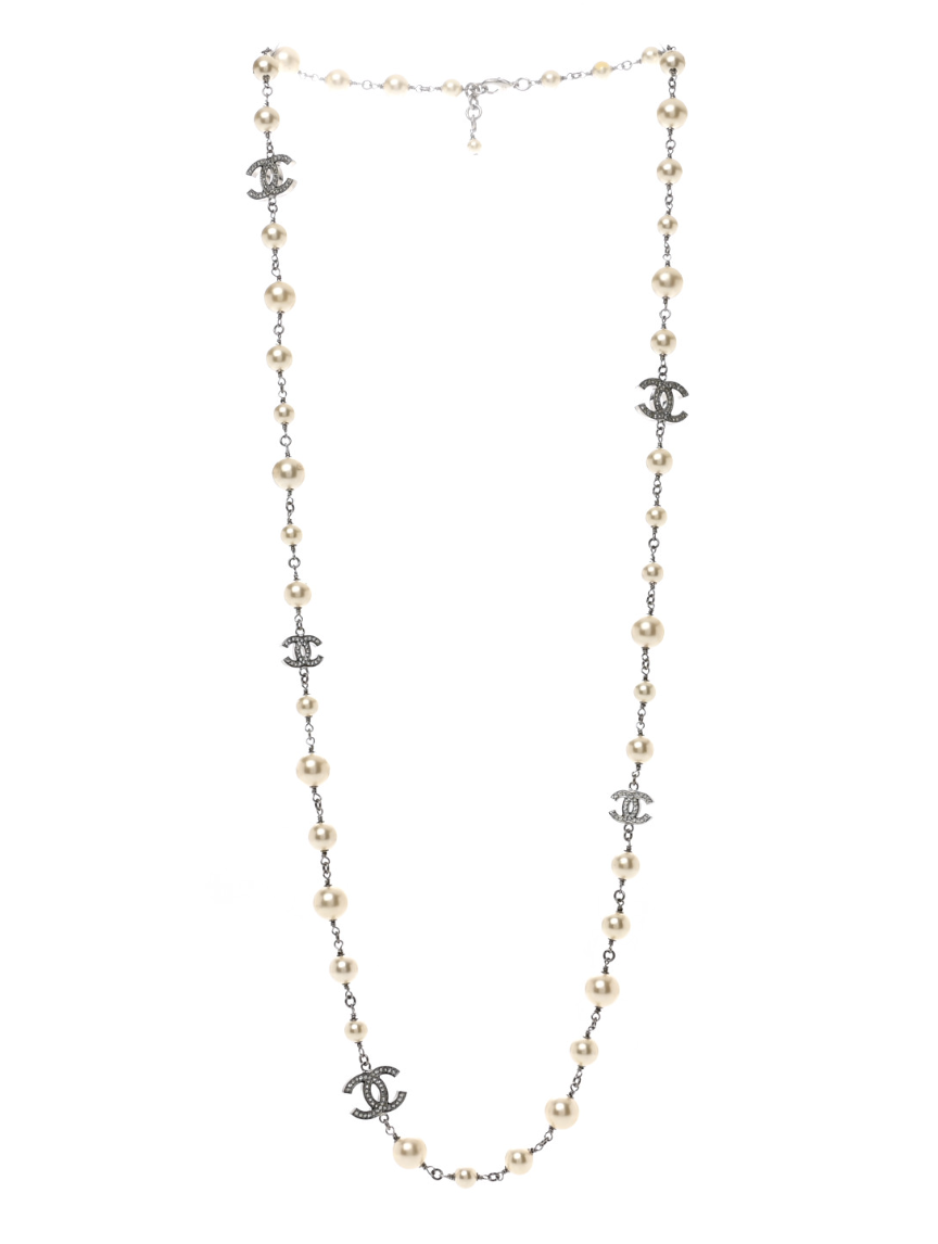CHANEL Graduated Pearl Crystal CC Long Necklace in Silver, $1,413 down from $1870